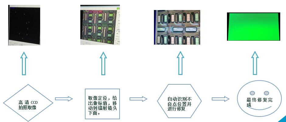主要應(yīng)用于TFT-LCD、IPS、LTPS、OLED等顯示面板行業(yè),針對制程當(dāng)中發(fā)光區(qū)域內(nèi)產(chǎn)生的亮點(diǎn)、灰亮點(diǎn)、亮線不良進(jìn)行鐳射修復(fù)。整個修復(fù)過程是通過高清像素CCD自動定位,拍照取像分析,給出不良點(diǎn)坐標(biāo),然后計算機(jī)根據(jù)指令將修復(fù)用的鐳射鏡頭移動到位,自動識別出不良點(diǎn)的形狀大小,激光會做出不同方式的維修。詳見如下圖解: