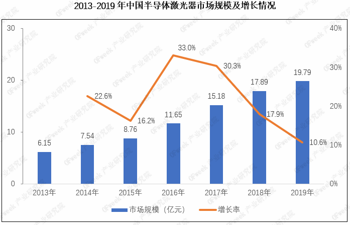2013年以來,我國光纖激光器市場規(guī)模逐年增長,CO2激光器市場被逐漸侵蝕,光纖激光器成為工業(yè)激光器最大產(chǎn)品結(jié)構(gòu),作為光纖激光器泵浦半導(dǎo)體激光器市場規(guī)模快速擴(kuò)大,2015年、2016年、2017年是我國半導(dǎo)體激光飛速發(fā)展的3年,2017年以后,由于部分光纖激光器龍頭廠商開始大批量單獨(dú)生產(chǎn)LD器件、LD芯片,減少了對半導(dǎo)體激光器泵浦采購。加之國內(nèi)宏觀經(jīng)濟(jì)發(fā)展壓力加大,國際貿(mào)易摩擦不斷,半導(dǎo)體激光器市場增速大幅放緩,到2019年,我國半導(dǎo)體激光器市場規(guī)模為19.79億元,同比增長10.6%,2013-2019年年復(fù)合增長率達(dá)到18.17%。