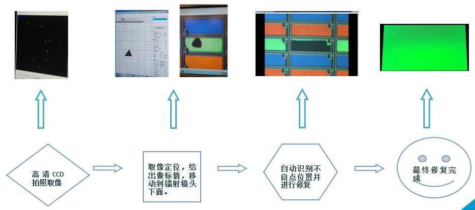 主要應(yīng)用于TFT-LCD、IPS、LTPS、OLED等顯示面板行業(yè),針對制程當(dāng)中發(fā)光區(qū)域內(nèi)因異物、短路產(chǎn)生的亮點(diǎn)、灰亮點(diǎn)、亮線不良進(jìn)行鐳射修復(fù)。整個(gè)修復(fù)過程是通過高清像素CCD自動定位,拍照取像分析,給出不良點(diǎn)坐標(biāo),然后計(jì)算機(jī)根據(jù)指令將修復(fù)用的鐳射鏡頭移動到位,自動識別出不良點(diǎn)的形狀大小,激光會做出不同方式的暗化維修。詳見如下圖解: